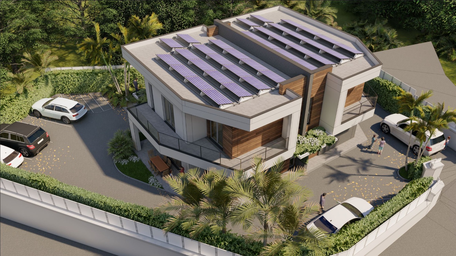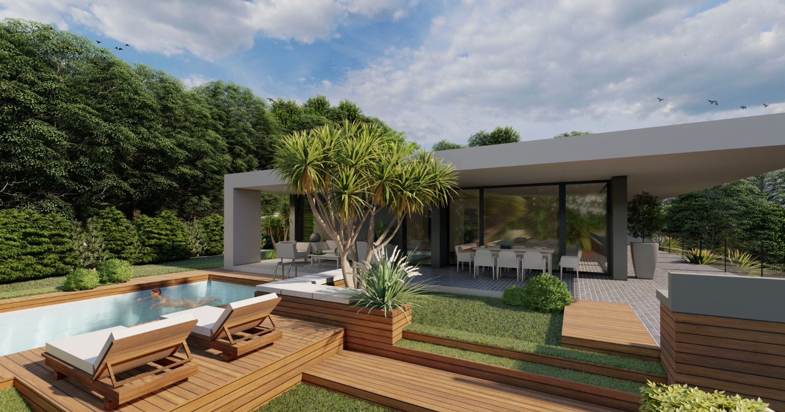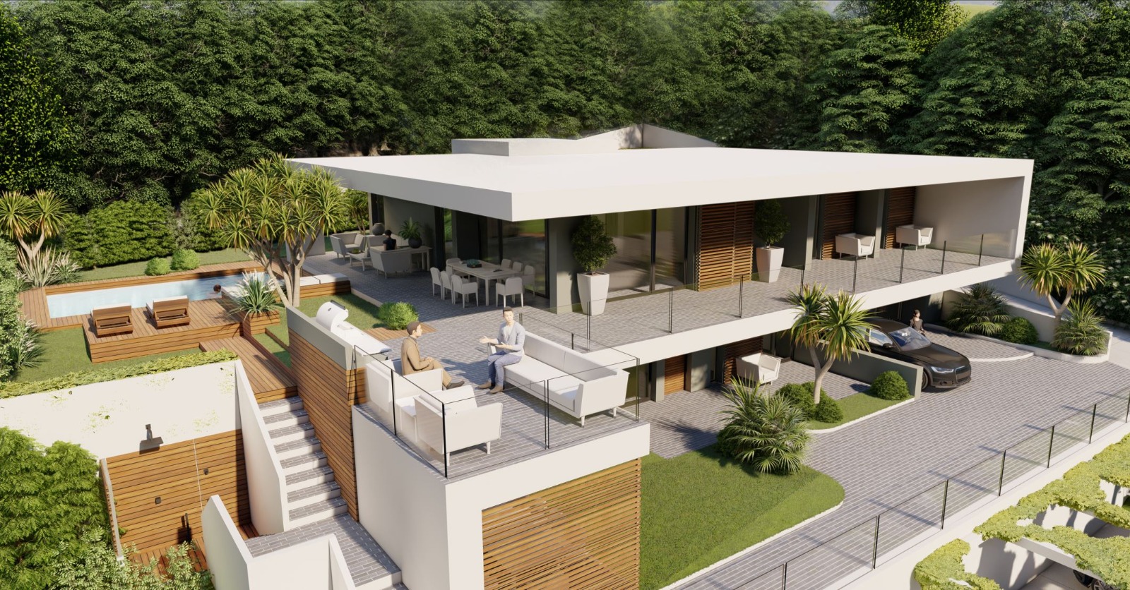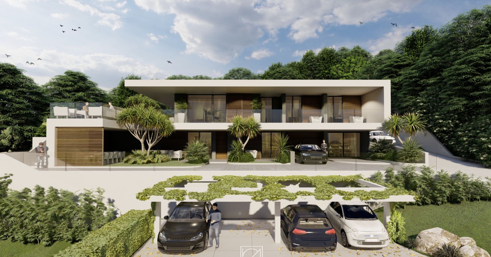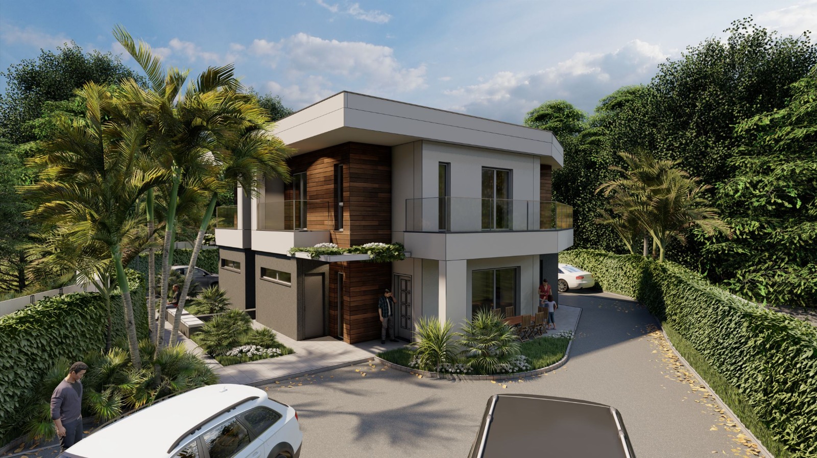 La villa si sviluppa su due livelli e presenta un design contemporaneo con linee pulite, volumi geometrici e ampie superfici vetrate che favoriscono l'ingresso della luce naturale e offrono una vista aperta sul verde circostante. Il giardino è curato nei minimi dettagli, con aiuole, piante ornamentali ed elementi decorativi. La zona piscina è raffinata e accogliente, con una pavimentazione in legno, una piscina rettangolare euna zona relax. La villa è caratterizzata da una copertura piatta e sporgente che crea porticati ombreggiati per gli spazi esterni. Il piano superiore ospita verande con vetrate scorrevoli, mentre il piano inferiore include spazi coperti per parcheggio e accessi indipendenti. Materiali come legno, vetro e cemento si combinano armoniosamente per creare un look sofisticato ma naturale.