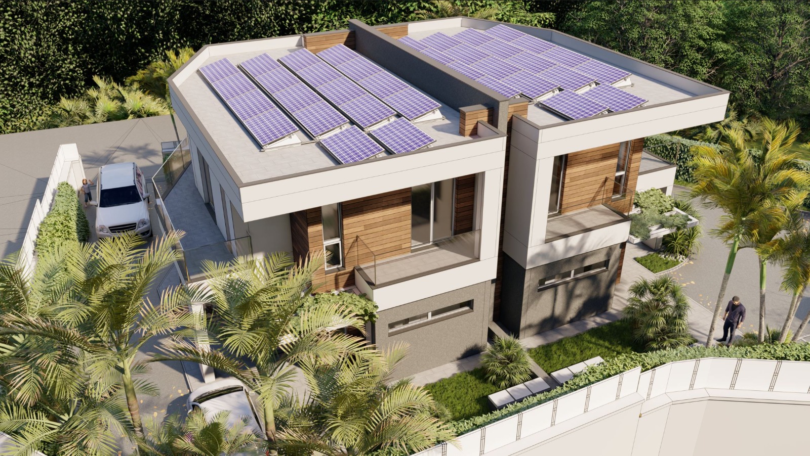 Questa moderna casa bifamiliare si distingue per il suo design contemporaneo, sostenibile ed efficiente, ideale per due nuclei familiari. La struttura è composta da due unità speculari, disposte su più livelli, ciascuna con ingresso indipendente, balconi privati e spazi verdi. L'estetica è moderna e raffinata, con l'uso di materiali di qualità come rivestimenti in legno, intonaco chiaro e finiture in cemento scuro che creano un elegante contrasto cromatico. Le ampie vetrate garantiscono grande luminosità agli ambienti interni e continuità visiva con l'esterno. Ogni unità dispone di un piccolo giardino privato e spazi pedonali ben curati. L'area di parcheggio privata è situata lateralmente all'edificio e garantisce accesso diretto alle abitazioni.